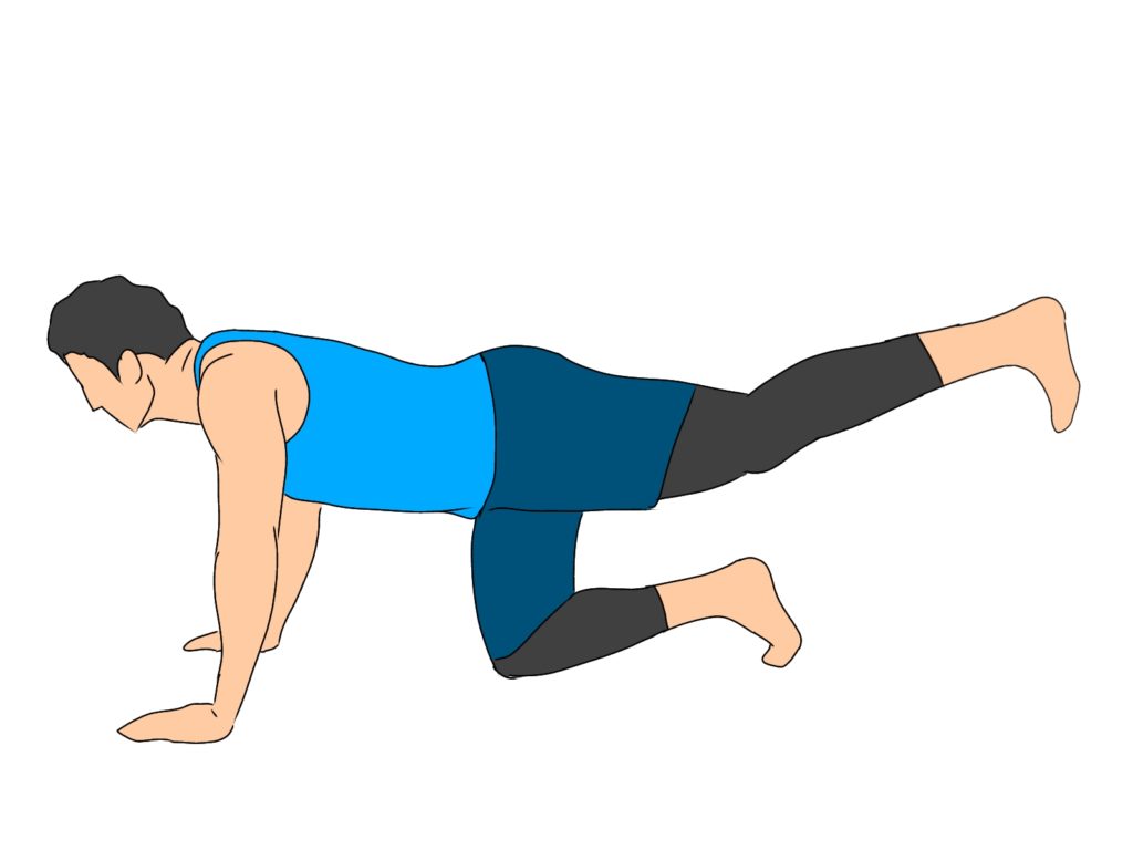 ②片方の足を真っすぐ後ろに伸ばし腰の高さまで持ち上げる