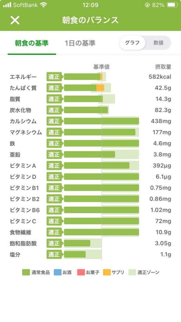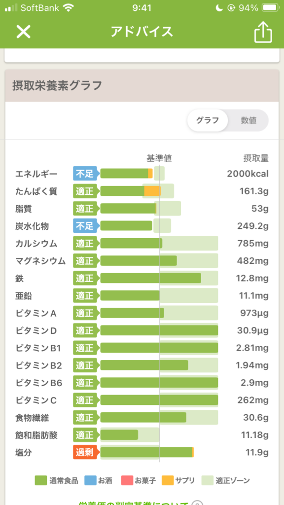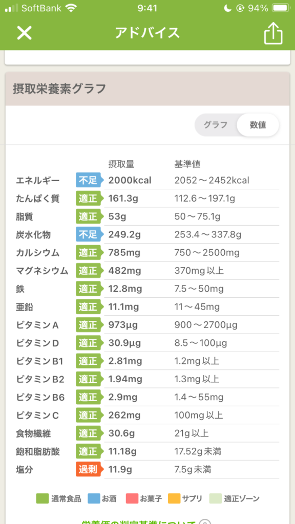 少しカロリーが不足していますが、ダイエット中はこれくらいでちょうど良いと思います。各栄養素はほば過不足なく摂れています。