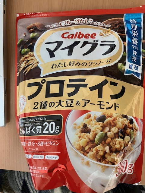 たんぱく質を摂るためプロテイングラノーラをチョイス(但し脂質もそれなりに高いので摂りすぎ注意。または同量のたんぱく質を含んだ低脂質のシリアルやグラノーラでも可)