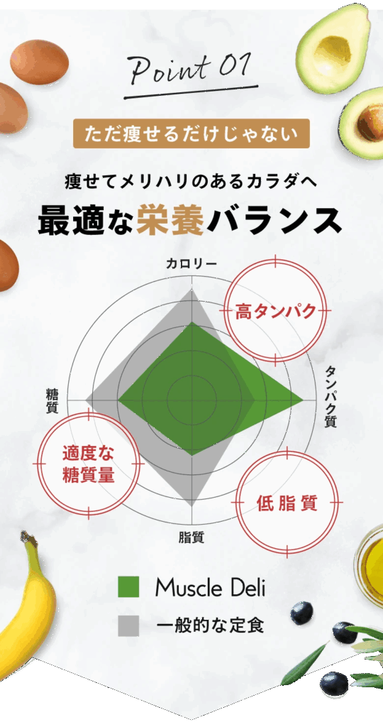 マッスルデリは筋肉をつけるために最も大切な栄養素であるタンパク質量を高く、カロリーの高い脂質を抑え、体のエネルギー源である炭水化物(糖質)を適度な量に調整し、PFCバランスを最適にするよう考えられています。