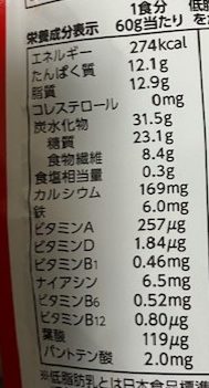 | 1食60当たり | カロリー(Kcal) | たんぱく質(g) | 糖質 | 食物繊維 | 脂質(g) |